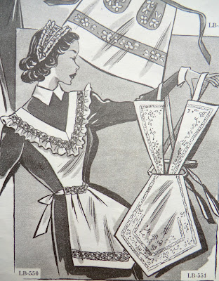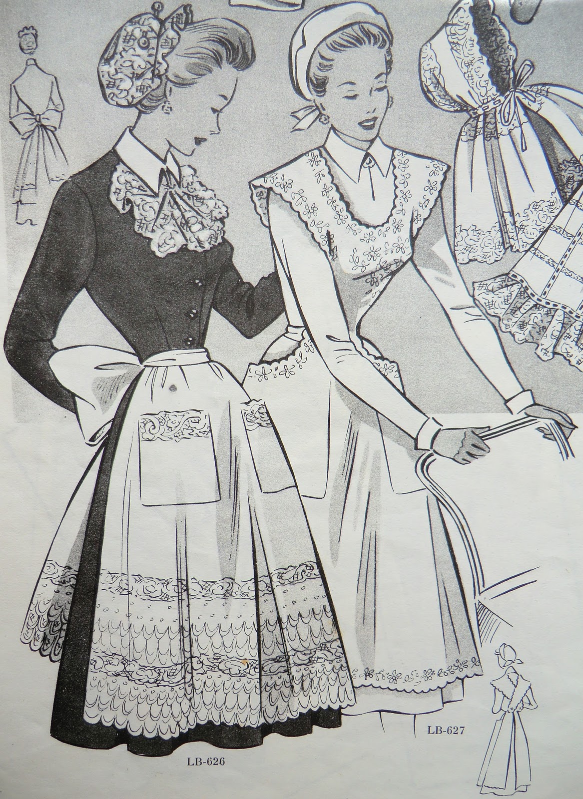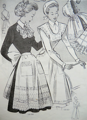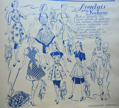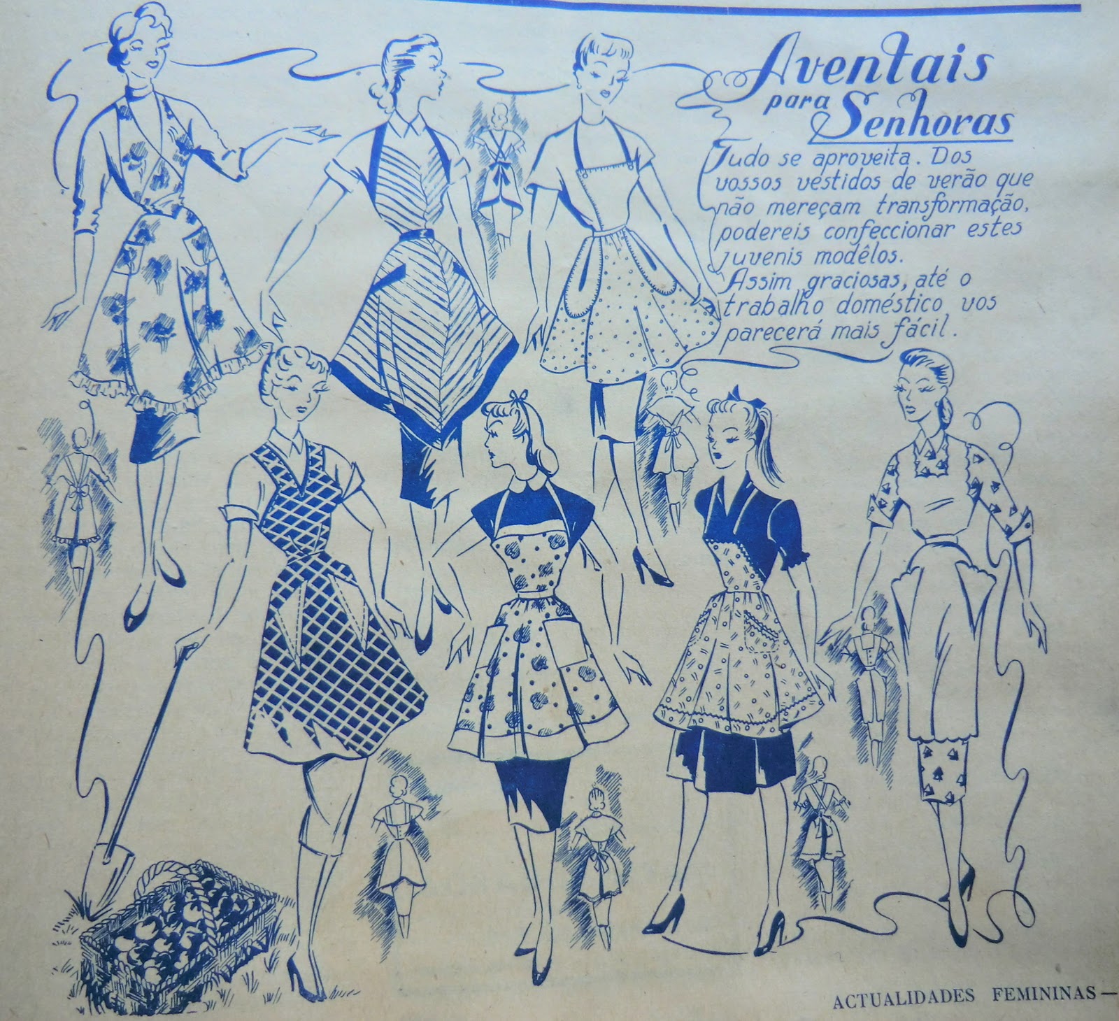 Para além do contraste nos modelos, há ainda a salientar o facto de que os aventais destinados às donas-de-casa podiam ser feitos com vestidos antigos reaproveitados. Preocupações económicas do pós guerra. Ou modelos para as novas donas-de-casa que já não podiam ter criadas fardadas, com aventais brancos, imaculados, com rendas e bordados?.
