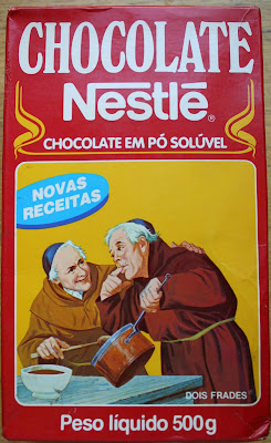 Encontrei uma caixa de chocolate em pó da Nestlé «Dois Frades». Data dos finais dos anos 80 e tem ainda o pó no seu interior.