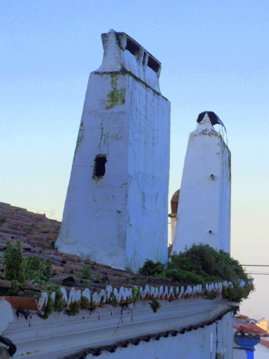 O Carlos Caria teve a amabilidade de me enviar duas fotos suas de chaminés alentejanas, na sequência do post anterior. A primeira foi tirada em Cabeço de Vide e apresenta duas chaminés idênticas, com saídas de fumo com coberturas diferentes, uma com tijolo e outra com folha de Flandres, resultado de adaptações. Na primeira chaminé pode observar-se o registo que permitia a entrada de ar frio que descia e criava correntes de ar no interior da chaminé, de forma a facilitar a saída dos fumos.