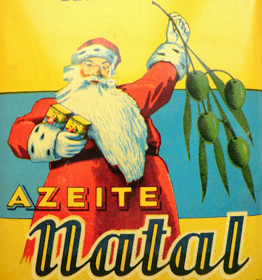 Começo com esta bela lata de «Azeite Natal», produzido por Carvalho & Sobrinho, de Elvas, fabricantes e exportadores de Frutas Doces e Secas, Azeitonas e Azeite. Desconheço a sua data, mas talvez tenha sido produzida na década de 1940-1950.
