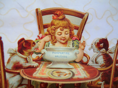 Este belo cartão publicitário recortado, que me veio parar às mãos, com uma menina sentada à mesa acompanhada pelo seu cão e gato, quase parece um seguimento do post anterior.