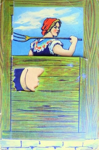 Ao abrir-se o cartão revela-se a verdadeira imagem de uma menina de formas curvilíneas com um leitão ao colo. O espaço era aproveitado para publicitar «o almoço da casa a preço económico».