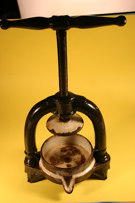 Este outro exemplar de prensa para fruta, que apresentamos, tem uma base diferente amovível. Falta-lhe o copo perfurado para receber os frutos.