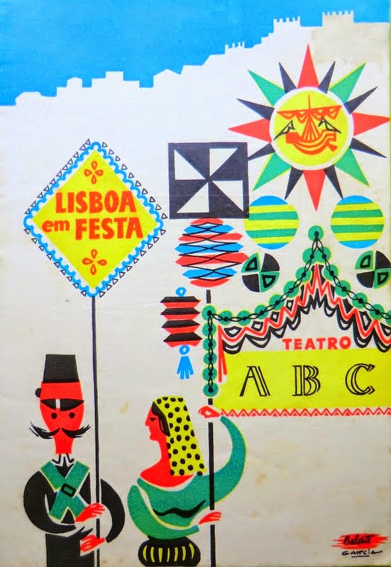 Mais comedido, mas igualmente colorido, é o desenho de capa de um catálogo para a revista «Lisboa em Festa», que teve lugar no Teatro ABC, em 1958. Está assinado Garcia e foi feito na Belarte.