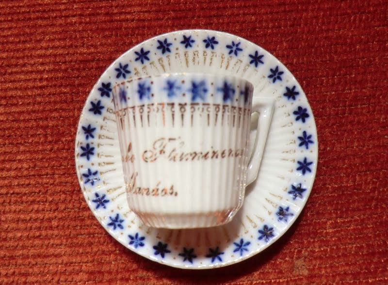 por 5 peças: um pires azul, uma chávena encarnada, uma taça amarela, um oveiro