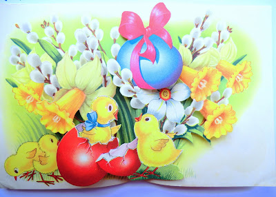 Um dia alegre como o destes pintainhos saídos do ovo, num postal desdobrável, imagens associadas ao aparecimento da Primavera e tomadas como símbolo da ressureição que se convencionaram associar à Páscoa.