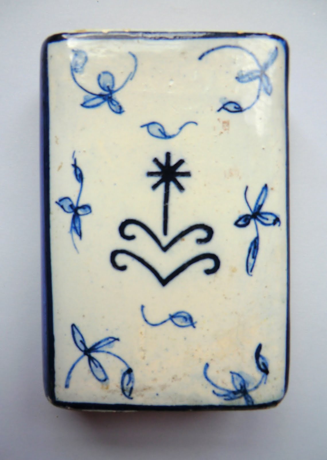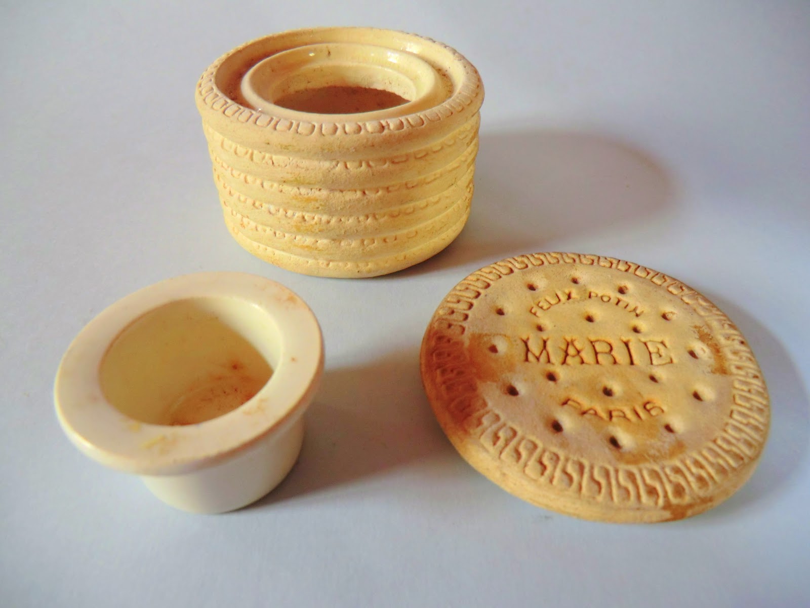 Bem, custa a acreditar mas, como podem ver, a caixa de bolachas é um tinteiro. É de origem francesa e tem na base uma marca que não consigo identificar.